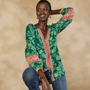 Opulent florals and elegant border prints combine to intoxicating effect. Sleek. body-skimming fit with flattering V-neck and three trios of delicate buttons. Cotton/silk. Machine wash. Imported. Exclusive. Sizes XS (0–2). S (4–6). M (8–10). L (12–14). XL (16–18). XXL (20–22). Approx. 26.5l.