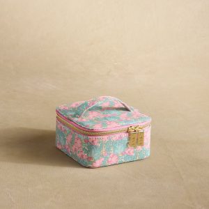 Covered in a high-quality cotton floral print from Liberty Fabrics. this handcrafted jewelry case will keep cherished pieces safe and damage-free while stored or travelling. The lid features spaces for rings and earrings. while the inside houses a detachable compartment with four individual zippered pockets for bracelets. necklaces and other trinkets. Pockets have clear EVA windows. Polyester suedette lining. Gold zip closure. 5 x 5 x 2-1/2d.