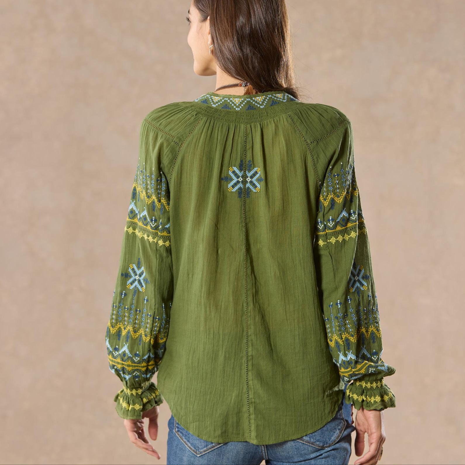 Our stylish peasant top is so flowy and breezy. cross stitched with colorful embroidery and finished with special lace insets. Elastic smocking at the cuff and notch neckline. colorful tassel ties. Cotton. Hand wash. Imported. Exclusive. Sizes XS (0–2). S (4–6). M (8–10). L (12–14). XL (16–18). XXL (20–22). Approx. 25l.